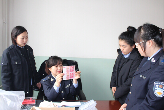 二、財務人員重點講解新版“100”元的變化特點、新舊版人民幣的異同及假幣鑒別方法,針對新版人民幣新增加的光彩光變數字“100”、橫豎雙號碼、調整膠印對印圖案和白水印等,著重對新舊版的不同進行對比,通過“一看二摸三聽四測”法,進一步加深收費人員的辨別能力。